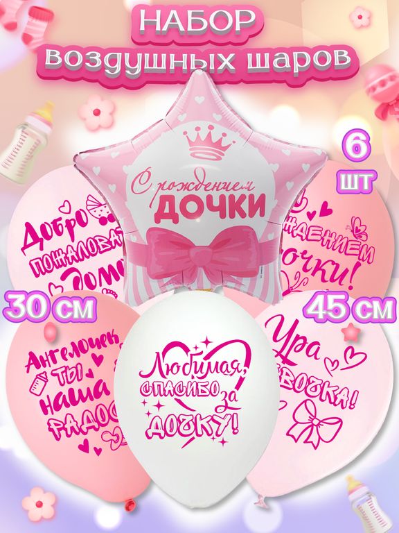 Каждый шарик имеет размер 30 см, что делает его идеальным для выписки новорожденной девочки. В состав сета входит 5 латексных шаров на грузике, 1 фольгированный шарик 45 см. что обеспечивает устойчивость и легкость использования. Кроме того, в комплект входит пакет для транспортировки, что делает его удобным для переноски.