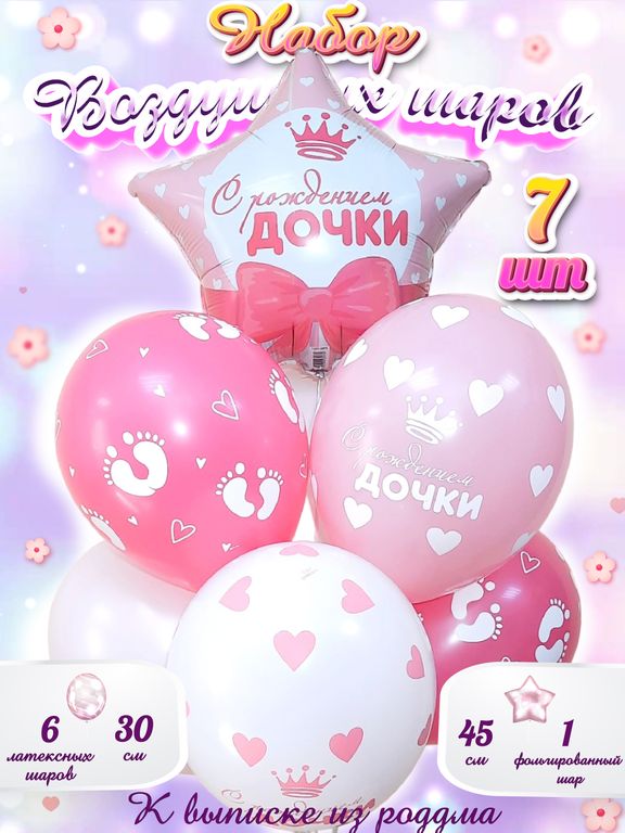 Каждый шарик имеет размер 30 см, что делает его идеальным для выписки новорожденной девочки. В состав сета входит 6 латексных шаров на грузике и 1 фольгированный шарик 45 см., что обеспечивает устойчивость и легкость использования. Кроме того, в комплект входит пакет для транспортировки, что делает его удобным для переноски.